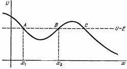 Проведем на графике прямую, соответствующую заданному значению полной энергии. Условию E> U(x) отвечает движение в области АВ или в области справа от С. Точки, в которых E = U(x) определяют границы движения и называются точками остановки. Движение в области, ограниченной двумя точками, называется финитным. Если область движения не ограничена или ограничена с одной стороны, то такое движение называется инфинитным. На рисунке АВ – область финитного движения, область справа от точки С – инфинитного.