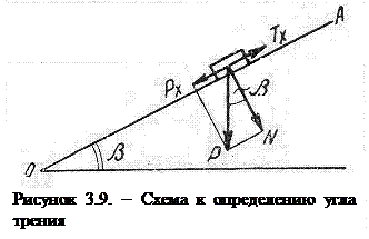 Начнем увеличивать наклон плоскости ОА. При этом сила Рх будет возрастать, и как только она сравняется с Тх – тело начнет скользить по наклонной поверхности. Угол наклона b в момент начала скольжения тела и будет углом трения. В момент начала скольжения Рх = Тх. Из рис. 3.9 отношение силы трения к нормальной силе равняется тангенсу угла трения, т.е.