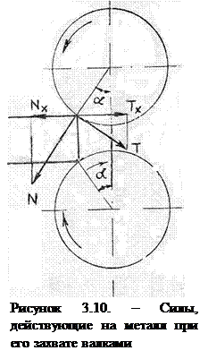 В момент соприкосновения полосы с валками она находится под воздействием нормальной силы давления N и касательной силы трения Т (рис. 3.10). Горизонтальные проекции этих сил будут Nх и Тх, направленные в разные стороны. Сила Nх стремится оттолкнуть полосу от валков, а сила Тх, наоборот – втянуть полосу в валки. Пока Nх > Тх захват полосы невозможен. Но как только установится условие Nх £ Тх , произойдет так называемый естественный начальный захват металла валками.