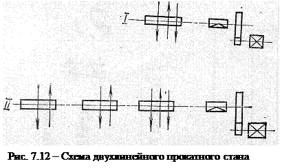 Станы линейного типа (рис.7.11) используют для прокатки заготовок, мелко-, средне- и крупносортных профилей. Недостатком таких станов являются большие затраты ручного труда, низкие скорости прокатки и производительность. Частично этих недостатков можно избежать размещением клетей в несколько линий (рис.7.12.).