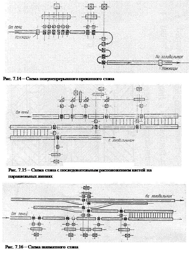 У станов с последовательным расположением клетей (рис.7.15) черновая группа может быть непрерывной, а последующие клети расположены друг за другом на расстоянии, превышающим длину раската. Для сокращения общей длины стана клети располагают в нескольких параллельных линиях. В этих клетях отпадает необходимость соблюдать правило секундных объемов. Такие станы используют в основном для прокатки среднего и крупного сорта.