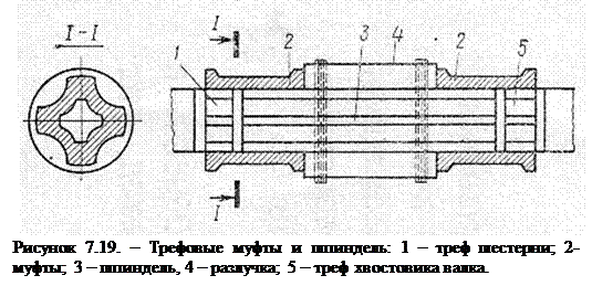 Для передачи вращения от двигателя к рабочим валкам – непосредственно или через редуктор и шестеренную клеть, - служат муфты и шпиндели. Используют пружинные, зубчатые, трефовые и др. муфты. Трефовые муфты (рис.7.19) отливают из чугуна, а шпиндели – изготавливают из кованой или катаной стали. Недостатком упомянутых муфт является ограниченный угол перекоса – 1…20. При большом перекосе (10…120)используют универсальные шпиндели. Изготовляют их из кованой стали марки 40…45ХН и др.