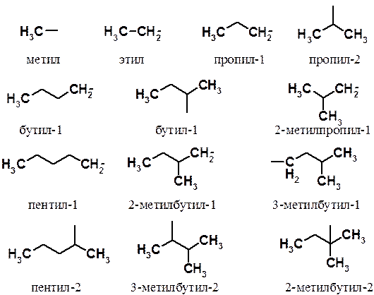 Названия группировок, постоянно встречающихся как структурные единицы в органических молекулах, образуют исходя из названия исходного алкана. Так, остатки, условно образующиеся отщеплением от алкана одного атома водорода, вместо окончания –ан имеют окончание –ил. Например, CH3- называют метил, C2H5- этил и т.д. Весь массив таких остатков называют алкильными группами.