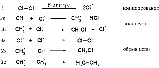 На первой стадии реакции (инициирование) под действием ультрафиолетового облучения или нагрева происходит гомолитический разрыв связи в молекуле хлора. Энергия этой связи - 58 ккал/моль (242,83 кДж/моль) - наименьшая среди участвующих в реакции молекул. В результате разрыва связи в молекуле галогена образуется атомарный хлор, имеющий неспаренный электрон и обладающий очень высокой реакционной способностью.
