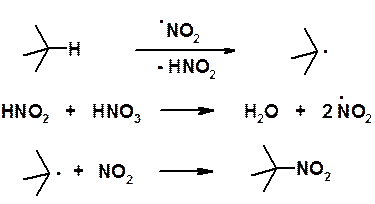 Реакция протекает по радикальному механизму. Хотя легкость замещения водорода при нитровании изменяется в обычной последовательности третичный > вторичный > первичный > метильный, реакция сопровождается деструкцией с образованием всех возможных мононитропроизводных.