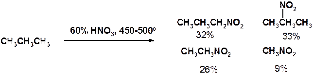 Как уже было отмечено выше, реакционная способность алканов низка. Наряду с хлорированием и бромированием можно отметить еще лишь несколько реакций. В 1888 г. М.И. Коновалов описал реакцию жидкофазного нитрования алканов. Реакция Коновалова протекает при 100-150оС под действием 10-15 % азотной кислоты.