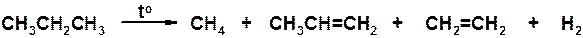Химической промышленности необходимо большее количество низших углеводородов, чем может быть извлечено из углеводородного сырья. Алканы подвергаю пиролизу (от греческих слов pyr – огонь и lisis – разрушение), т.е. термическому разложению. Пиролиз алканов называют крекингом. Термический крекинг состоит в пропускании алканов через металлическую колонку, нагретую до высокой температуры (от 450 до 900оС). При этом высшие алканы превращаются в насыщенные соединения с меньшим молекулярным весом, алкены и водород. В качестве примера приведем крекинг пропана, приводящий к образованию пропилена, этилена, метана и водорода.