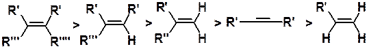 Как видно из схемы, возможно образование двух изомерных веществ - производных бутена-1 и бутена-2. Направление реакции предсказывает правило Зайцева: в ходе реакции элиминирования образуется алкен с наибольшим числом заместителей при двойной связи. Это правило совпадает с рядом устойчивости алкенов, которая убывает в ряду: