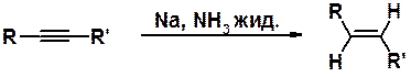 Похожий результат может быть получен при гидрировании алкинов металлическим натрием в жидком аммиаке. Принципиальное отличие этой реакции от каталитической в том, что образуются алкены транс- или Z-конфигурации.