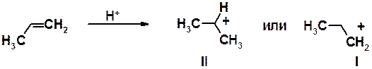 Присоединение протона к двойной связи может теоретически привести к одному из двух карбониевых катионов: первичному (I) или вторичному (II). На практике основной процесс – образование катиона II. Для объяснения этого факта рассмотрим ключевую стадию реакции – присоединение протона.