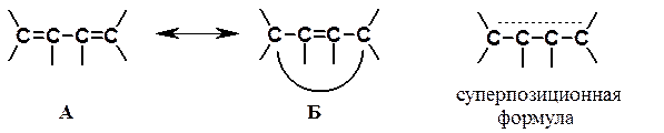 Ниже представлены граничные структуры бутадиена (А и Б) и их суперпозиция. Пунктирная линия показывает делокализацию p-электронов, т.е. что в реальной молекуле p-электронная плотность находится не только между 1 и 2, 3 и 4 атомами углерода, но и между 2 и 3 атомами.