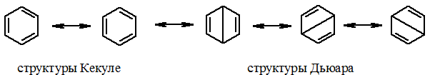 Строение бензола стало понятным только в 30-х года XX века, после появления теории резонанса Л. Полинга (см. лекцию «Диены»). Бензол нельзя описать одной структурной формулой, поэтому используется набор граничных структур: