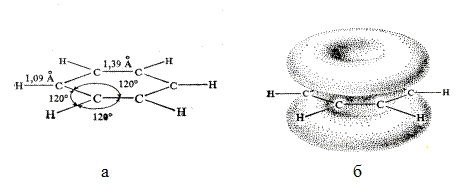 Рис. 17.2. Форма и размеры (а) и форма p-электронных облаков (б) молекулы бензола.