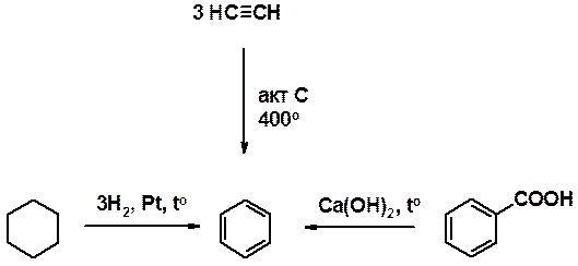 Синтетически бензол может быть получен дегидрированием циклогексана, тримеризацией ацетилена и декарбоксилированием бензойной кислоты.