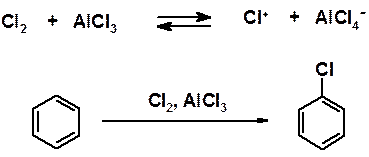 Реакции идут только в присутствии катализаторов – кислот Льюиса. При хлорировании обычно используют безводный AlCl3, при бромировании – FeBr3. Взаимодействие хлора или брома с соответствующей кислотой Льюиса генерирует в реакционной смеси электрофил: