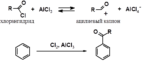 Отличие от предыдущей реакции в том, что в кольцо вводят не остаток алкана, а остаток карбоновой кислоты – ацил. В результате реакции образуются кетоны.