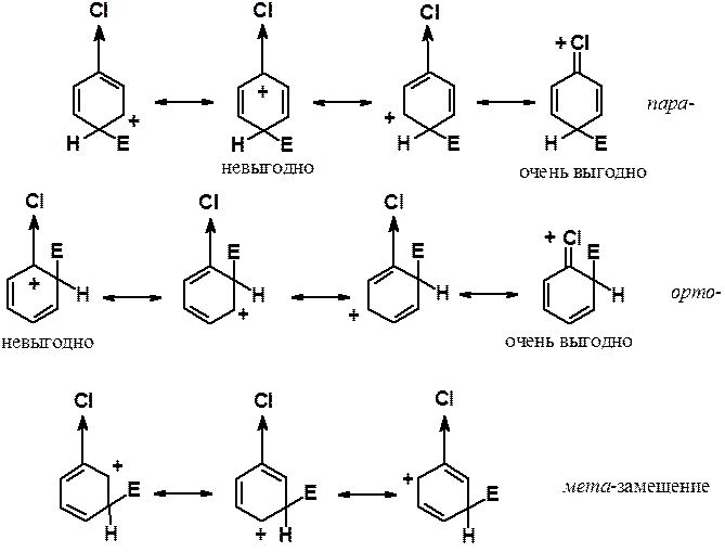 Анализ строения s-комплексов, образующихся в ходе реакций электрофильного замещения в галогенопроизводных бензола показывает, что при реакциях в орто - и пара -положения есть по одной энергетически невыгодной граничной структуре, в которых акцепторный атом галогена связан с положительно заряженным углеродом. Кроме того, есть по одной выгодной структуре за счет сопряжения четырех p-электронов цикла с электронной парой атома галогена. При реакциях в мета -положение нет ни особо выгодных, ни особо невыгодных граничных структур. При орто - и пара -замещении интермедиаты могут быть изображены с помощью четырех граничных структур, при мета -замещении – трех. Таким образом, галогены, являясь дезактивирующими заместители, уменьшают реакционную способность всех положений (о -, м - и п -) бензольного цикла, но понижение реакционной способности в орто - и пара -положениях выражено в меньшей степени, чем в мета -.