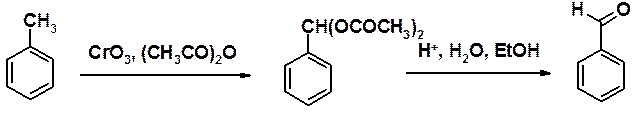 Такое окисление обычно проводят жесткими окислителями, такими как KMnO4, оксиды или соли хрома и т.п. Первоначально в этой реакции образуется альдегид, который обычно не удается выделить, поскольку он окисляется легче, чем углеводород.