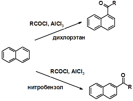 Направление ацилирования по Фриделю-Крафтсу зависит от природы растворителя, в котором проводится реакция.