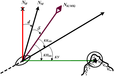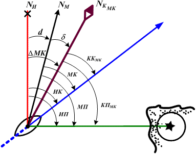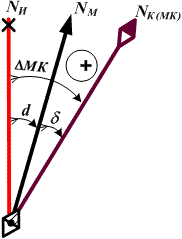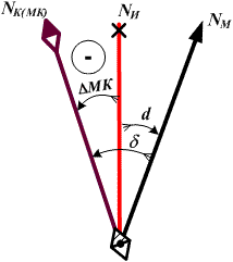Если магнитный компас находится на судне и подвержен влиянию его полей, то Δ МК = d + δ, тогда (рис. 3.18):