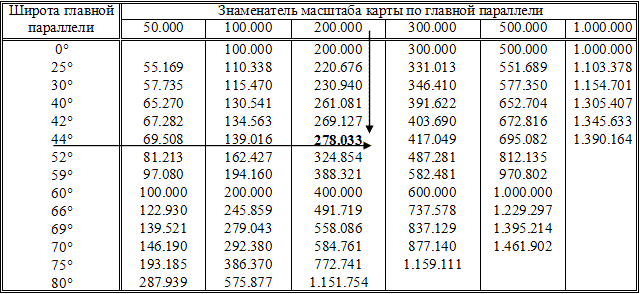 Таблица предназначена для перевода масштабов по главным параллелям указанным на картах в проекции Меркатора в экваториальный масштаб и рассчитана по формуле: