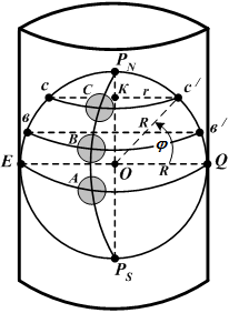 Следовательно, длина экватора равна длине соответствующей параллели, умноженной на секанс широты этой параллели. Все параллели, удлиняясь до длины экватора, растягиваются пропорционально sec φ.