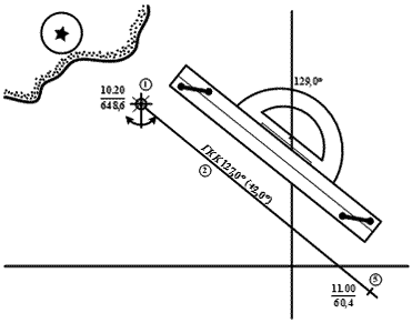 при условии, что SЛ = SОБ → отложить его значение (в масштабе карты) от исходной точки по линии истинного курса и нанести счислимое место судна (на 11.00) условным знаком (штрих