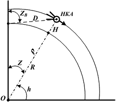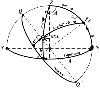 - Z = 90° – h – зенитное расстояние НКА;