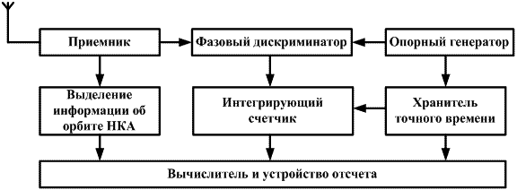Такое измерение можно осуществить по блок-схеме (рис.6.3) путем непрерывного сравнения частоты колебаний, принимаемых от НКА, с частотой колебаний опорного генератора и интегрирования набега фазы за счет эффекта Доплера.