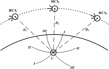 Для определения места судна одновременно принимают данные не менее чем от трех НКА (рис.6.5). При пересечении линий положения I–I, II–II, III–III может получиться фигура погрешностей (треугольник).