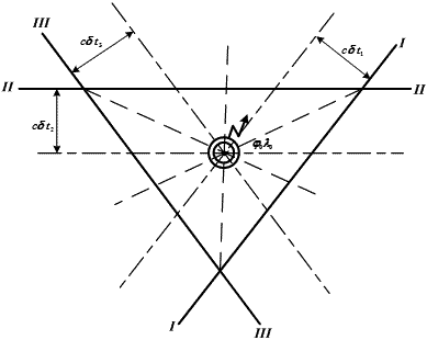 Треугольник погрешностей получается из-за присутствия в измеренных расстояниях D1,2,3 постоянных погрешностей сδt. Найдя место судна (φ0 λ0) методом биссектрис можно найти и постоянную погрешность сδt, возникающую из-за расхождения временных шкал НКА и ПИ.