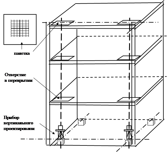 Способ оптической вертикали применяется для передачи осей по вертикали, выверке конструкций и контроле кренов сооружений, агрегатов и оборудования с продольной вертикальной осью. Наибольшее применение он находит при контроле объектов одного поперечного сечения и в стесненных условиях, когда оптические способы измерений с применением теодолитов затруднительны.