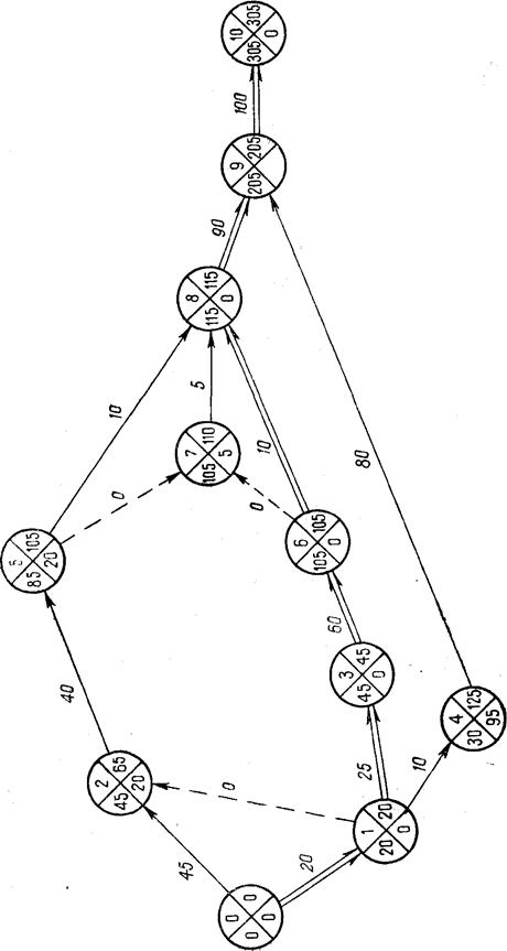 Для нашего сетевого графика имеем T 10 (n) = T 10 (p) =305. Далее находим: из событий 9, 8, 7 выходит по одной дуге, поэтому T 9 (n) = 305–100 =205; T 8 (n) =205–90=115; T 7 (n) =115–5=110;
