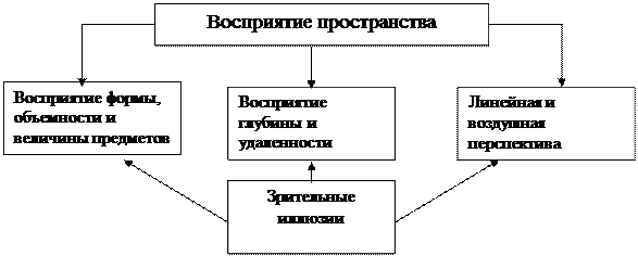 Восприятие пространства играет большую роль во взаимодействии человека с окружающей средой, являясь необходимым условием ориентировки в ней человека. Оно представляет собой отражение объективно существующего пространства и включает восприятие формы, величины и взаимного расположения объектов, их рельефа, удаленности и направления, в котором они находятся (рис. 62)[37].