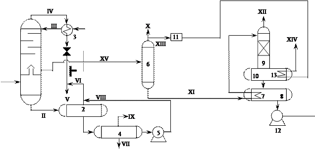 I-продукция скважин; II-отделённая капельная жидкость; III-раствор гликоля; IV-высушенный газ; V-газо-конденсатная смесь на берег; VI-основной конденсат; VII-вода; VIII-остаточный конденсат; IX-остаточный газ; X-газ на собственные нужды; XI-дегазированный отработанный раствор гликоля; XII-пары воды в атмосферу; XIII-газ на сжигание в топке под давлением; XIV-дым; XV-отработанный раствор гликоля.