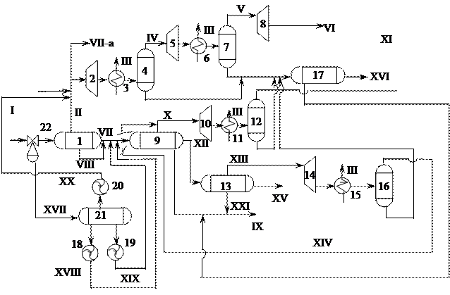 I – продукция скважин; II – газ первой ступени сепарации; III – морская вода; IV – газ первой ступени компримирования; V – газ второй ступени компримирования; VI – газ в подводный трубопровод на берег; VII-а – газ на собственные нужды; VII – нефтяная фаза на вторую ступень сепарации; VIII – водяная фаза с первой ступени сепарации; IX – вода со второй ступени сепарации; X – газ второй ступени сепарации; XI – компримированный газ второй ступени сепарации; XII – нефтяная фаза со второй ступени сепарации; XIII – газ третьей ступени сепарации; XIV – компримированный газ третьей ступени сепарации; XV – стабильная нефть в танкер; XVI – конденсат; XVII – продукция скважин на замер; XVIII – водяная фаза с замерного сепаратора; XIX – нефтяная фаза с замерного сепаратора; XX – газовая фаза с замерного сепаратора; XXI – водяная фаза с сепаратора третьей ступени.