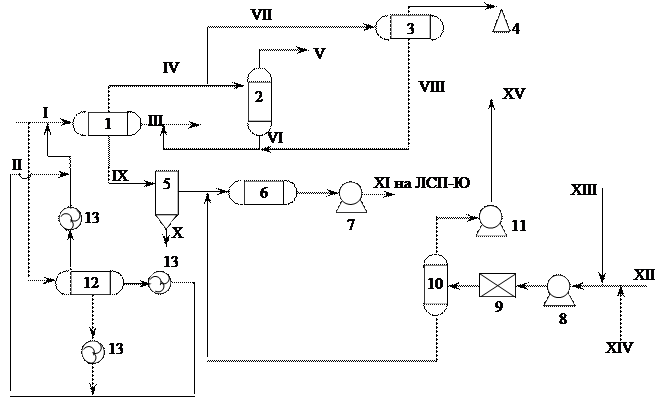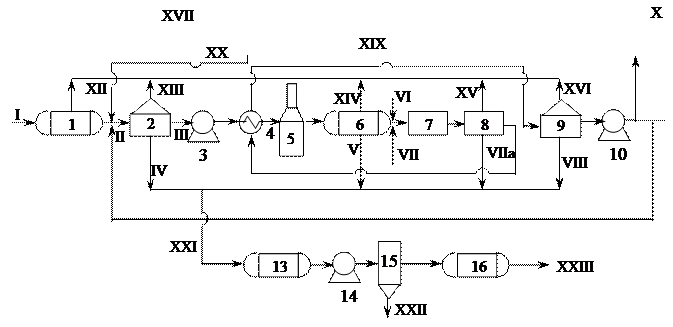 Вся вода, собранная из аппаратов (поток XXI), направляется в ёмкость – 13, откуда насосами – 14 прокачивается через гидроциклон – 15. Отделённые механические примеси (поток XXII) направляются на захоронение, а очищенная вода накапливается в буферной ёмкости – 16 и потоком XXIII направляется на утилизацию.