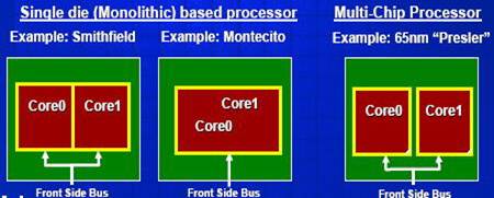 1. Независимые процессорные ядра, каждое со своей кэш-памятью, расположены на одном кристалле и просто используют общую системную шину. Это - 90-нанометровый Pentium D на ядре Smithfield.