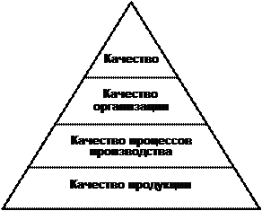 Когда говорят о качестве, обычно выделяют качество продукции (результатов деятельности), качество технологических процессов, качество всех процессов организации в целом, а также качество системы качества предприятия. Качество можно представить в виде пирамиды (рис. 1.2).