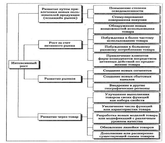 Несмотря на то, что рассмотренная стратегическая альтернатива интенсивного роста связана с наименьшим риском, она в конечном итоге ограничена размерами рынка, сменой технологий, появлением новых товаров, изменением вкусов и предпочтений покупателей.
