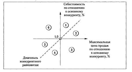 Выделяются шесть зон, каждая из которых отвечает особой конкурентной позиции. Диагональ «конкурентного равновесия» разделяет благоприятные зоны — 2, 3 и 4, где продукция фирмы имеет определенное превосходство над аналогичным товаром прямого конкурента, и неблагоприятные зоны — 1, 5 и 6, где фирма не обладает относительным конкурентным преимуществом.