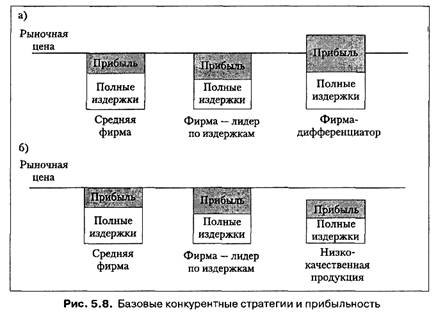 Следует учитывать, что превосходство в более низких издержках проявляется тогда, когда фирма предлагает продукцию среднеотраслевого стандарта качества (рис. 7.8, а). В противном случае, если снижение себестоимости продукции сопряжено со снижением качества и делает ее малопривлекательной в глазах потребителей, низкокачественную продукцию приходится реализовывать по цене ниже среднеотраслевой, что перестает приносить дополнительную прибыль (рис. 7.8, б).