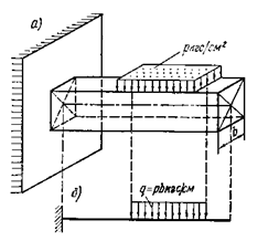 Распределенная нагрузка – передается на сооружение через определенную площадь и измеряется в единицах силы, отнесенной к единице площади (кн/м2, кн/см2, н/мм2). К числу таких нагрузок относится давление сыпучих материалов и жидкости на стенки резервуаров (рис. 1.3,а), давление воды на пластину (рис. 1.3,б) и т.п.