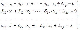 В эквивалентной системе, также как в заданной, перемещения по направлению отброшенных связей должны равняться нулю. На основании принципа независимости действия сил перемещения по