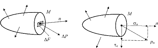, а проекция на плоскость, проходящую через точку М и ортогональную векторуn, — касательным напряжением