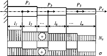 применима только в случае, когда по длине стержня ни жесткость поперечного сечения, ни продольная сила не изменяются (EF =const, Nz =const). Удлинение стержня со ступенчатым изменением EF и Nz (рис. 7) может быть определено как сумма удлинений ступеней, у которых EF и Nz постоянны: