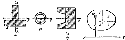 , представляющим собой центробежный момент инерции сечения относительно осей у и z; было доказано, что если ось Oz является осью симметрии, этот интеграл обращается в нуль.