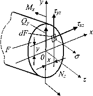 Сделаем несколько замечаний, касающихся расчетов на прочность при прямом поперечном изгибе. В отличие от простых видов деформации, когда в поперечных сечениях стержня возникает лишь один силовой фактор, к которым относятся и изученные выше растяжение (сжатие) и чистый изгиб, прямой поперечный изгиб должен быть отнесен к сложным видам деформации. В поперечных сечениях стержня при поперечном изгибе возникают два силовых фактора: изгибающий момент Мх и поперечная сила Qy (рис. 7), напряженное состояние является упрощенным плоским, при котором в окрестности произвольно выбранных точек поперечного сечения действуют нормальные
