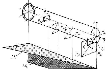 Известно, что косой изгиб имеет место, когда силы, его вызывающие, не лежат в одной из главных плоскостей инерции. Однако, если разложить внешние силы по главным осям инерции Ох и Оу, то получим две системы сил P1x, P2x, …, Pnx и P1y, P2y,..., Pny, каждая из.которых вызывает прямой изгиб с изгибающими моментами соответственно My и Мx (рис. 2). Применяя принцип независимости действия сил, нормальные напряжения