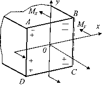 Слагаемые в этом выражении рекомендуется определять по модулю, а знаки ставить по смыслу. Например, на рис. 5 верхний ряд знаков «+» и «—» соответствует напряжениям от Мx, а нижний ряд — от My, и напряжения в этих точках будут равны